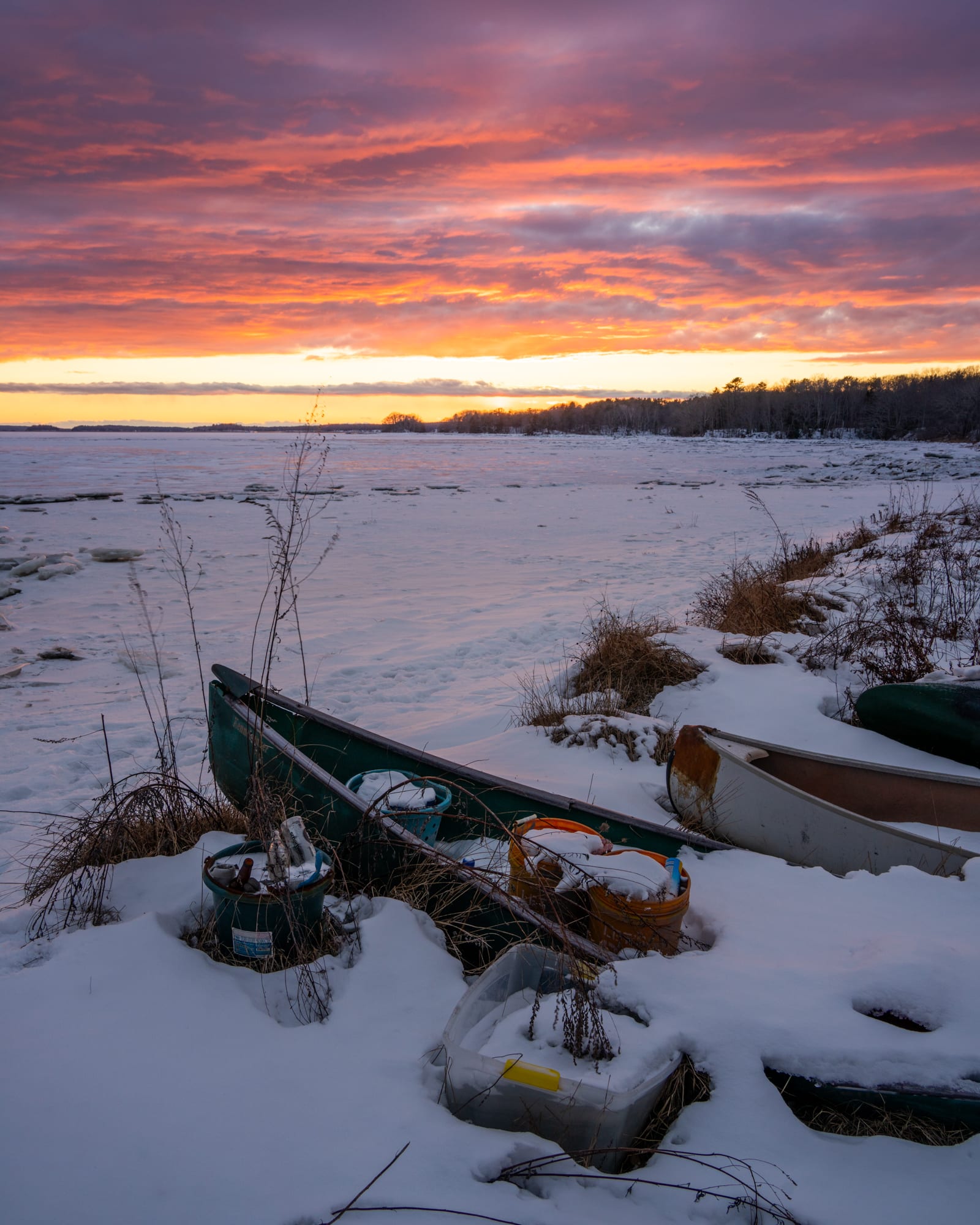 Onwards to a completely totally different type of Maine working boat. Clammers use these canoes within the hotter months, however right here they’re drawn up on the snowy shoreline of Maquoit Bay in Brunswick. I acquired out and x-c skied throughout the frozen ocean to a small island from Simpson’s Point, close by, on one other day this winter. It was wild!