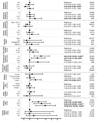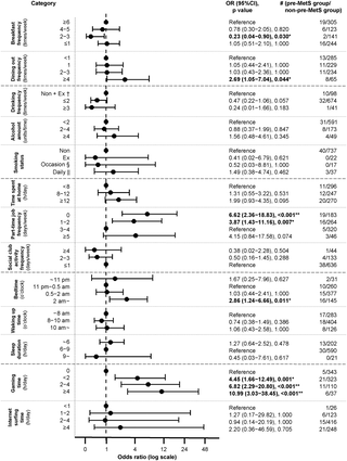 Fisher’s actual check evaluation of life-style components within the pre-MetS and non–pre-MetS teams revealed that the next have been considerably related to pre-MetS: having breakfast of two–3 occasions/week (OR 0.23, p = 0.030), eating out ≥4 occasions/week (OR 2.69, p = 0.044), part-time job frequency of 0 (OR 6.62, p < 0.001) and 1–2 (OR 3.87, p = 0.007) occasions/week, bedtime after 2 am (OR 2.86, p = 0.011), and gaming time <2 (OR 4.45, p = 0.001), 2–4 (OR 6.82, p < 0.001), and ≥4 (OR 10.99, p < 0.001) h/d (Fig 2).
