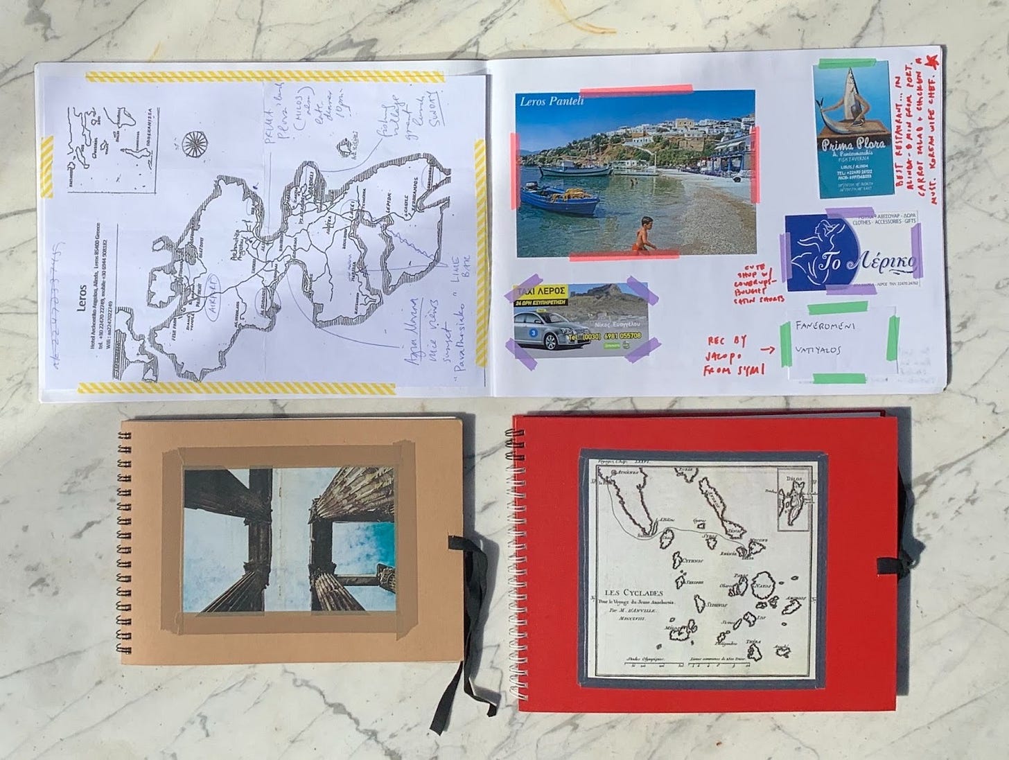 For years I had this method of taking alongside washi tape, a pocket book, watercolors, pens, and I’d usually print out a classic map of the place we have been going. Once there, I’d acquire enterprise playing cards, stubs, postcards, and many others…after which, with my daughter, we’d tape these in, together with drawings, work, and our notes. This labored till she turned a young person and didn’t need something to do with journaling, so I began saving all the things from a visit into an envelope, and with all of the intentions of placing them right into a journal. Some of them made it, some are simply in a giant classic suitcase the place I maintain a number of journey ephemera. —Yolanda