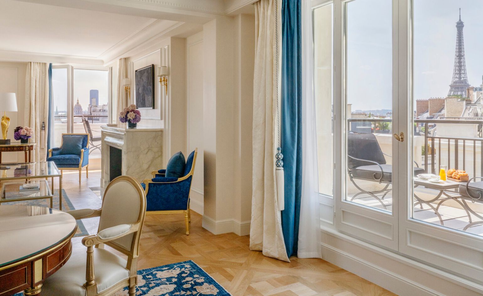 The Eiffel Parisian Suite adopts a extra architectural, family-oriented register. A main suite connects to 2 further bedrooms, unified by a pale blue and off-white palette. Villari ceramics, Artemest vases and restored porcelain gentle fittings sit alongside a Calacatta Oro marble hearth, whereas reception rooms open onto two enclosed, landscaped terraces furnished with black wrought-iron items by Hervé Baume.