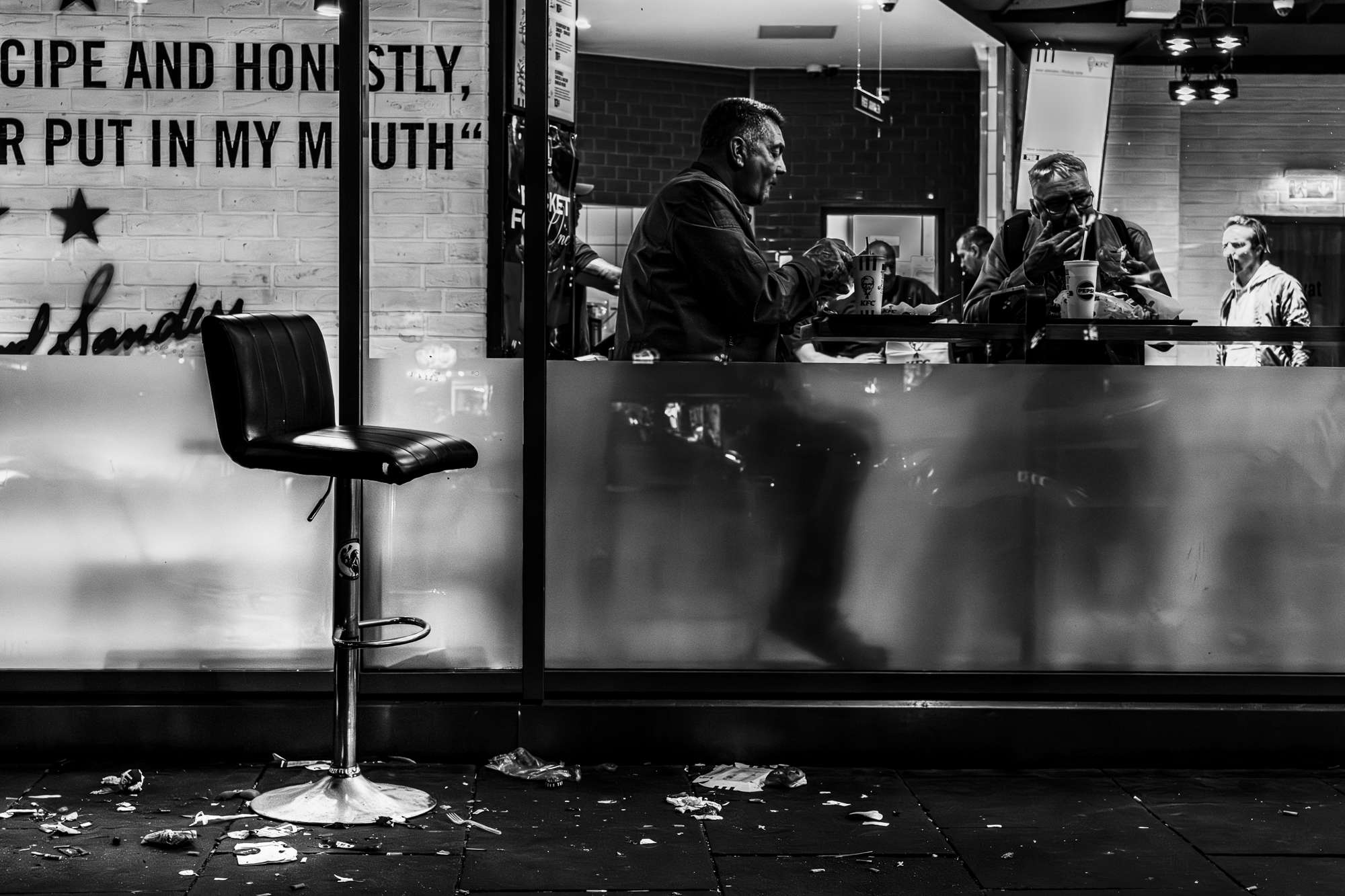 I work in black and white as a result of it strips the evening to its structural essence: mild, shadow, fragile human presence. Neon turns into rhythm, silhouettes turn into fragments in a collective equipment. At instances, fragile humanity breaks via – a person together with his canine, a pause at a meals stall – however at all times as a part of the bigger order.