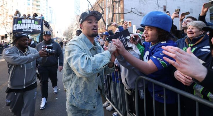 The trophy ceremony started at 10 a.m. at Lumen Field, the place gamers and coaches took the stage to cheers from the group, nonetheless buzzing from Seattle’s 29-13 win over the New England Patriots. Quarterback Sam Darnold and linebacker Ernest Jones IV had been amongst these addressing followers, thanking the town for its assist and calling the championship a shared accomplishment.