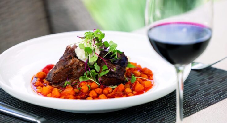 Braised Colorado quick ribs with Moroccan-spiced butternut squash and chickpea stew, topped with goat cheese.