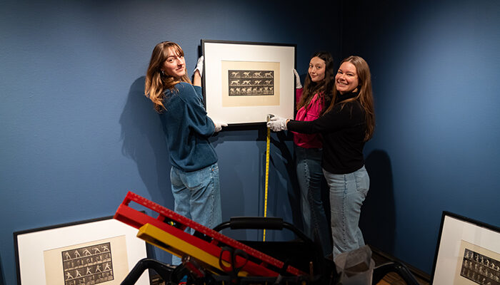 Class of ’26 art-history majors Lena Rimmer, Anna Radigan and Abigail Allport researched Muybridge’s work and curated the Trout Gallery exhibition. Photo by Dan Loh.