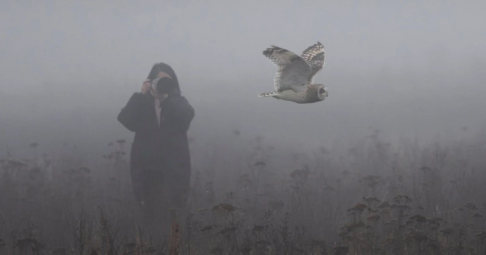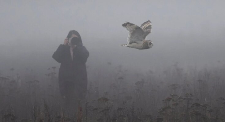 A person in a dark hooded coat photographs a flying owl in a misty, fog-covered field with dry, tall plants. The scene appears moody and atmospheric.