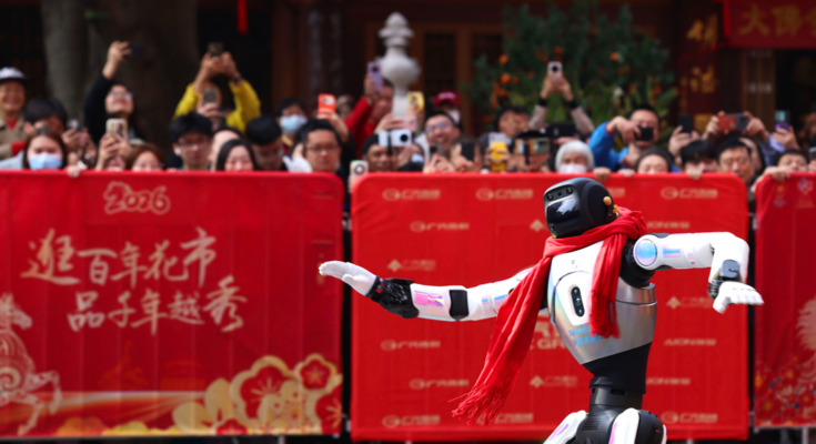 A humanoid robotic performs on the 2026 Guangzhou Yuexiu Xihu flower market in Guangzhou, South China’s Guangdong province, on Feb 13, 2026. (PARKER ZHENG / CHINA DAILY)