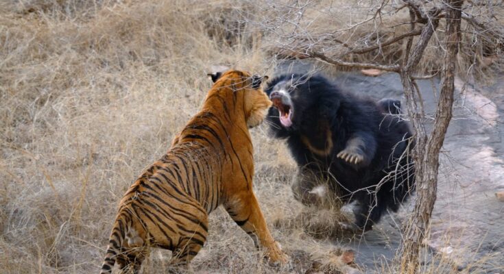 Now on all fours, it turned and charged on the tiger. As the sloth bear took the lead, the feline retreated progressively. The offended bear stored up the stress with vociferous loud calls and tried to assault the tiger with its lengthy claws, earlier than each animals disappeared contained in the bushes.