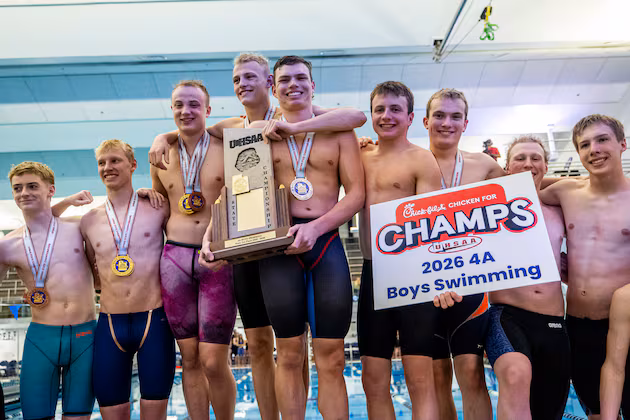 Mountain Crest swimmers maintain the boys crew championship trophy after taking first place within the UHSAA 4A State Swim Meet held on the Richards Building Pool in Provo on Saturday, Feb. 14, 2026. | Isaac Hale, Deseret News