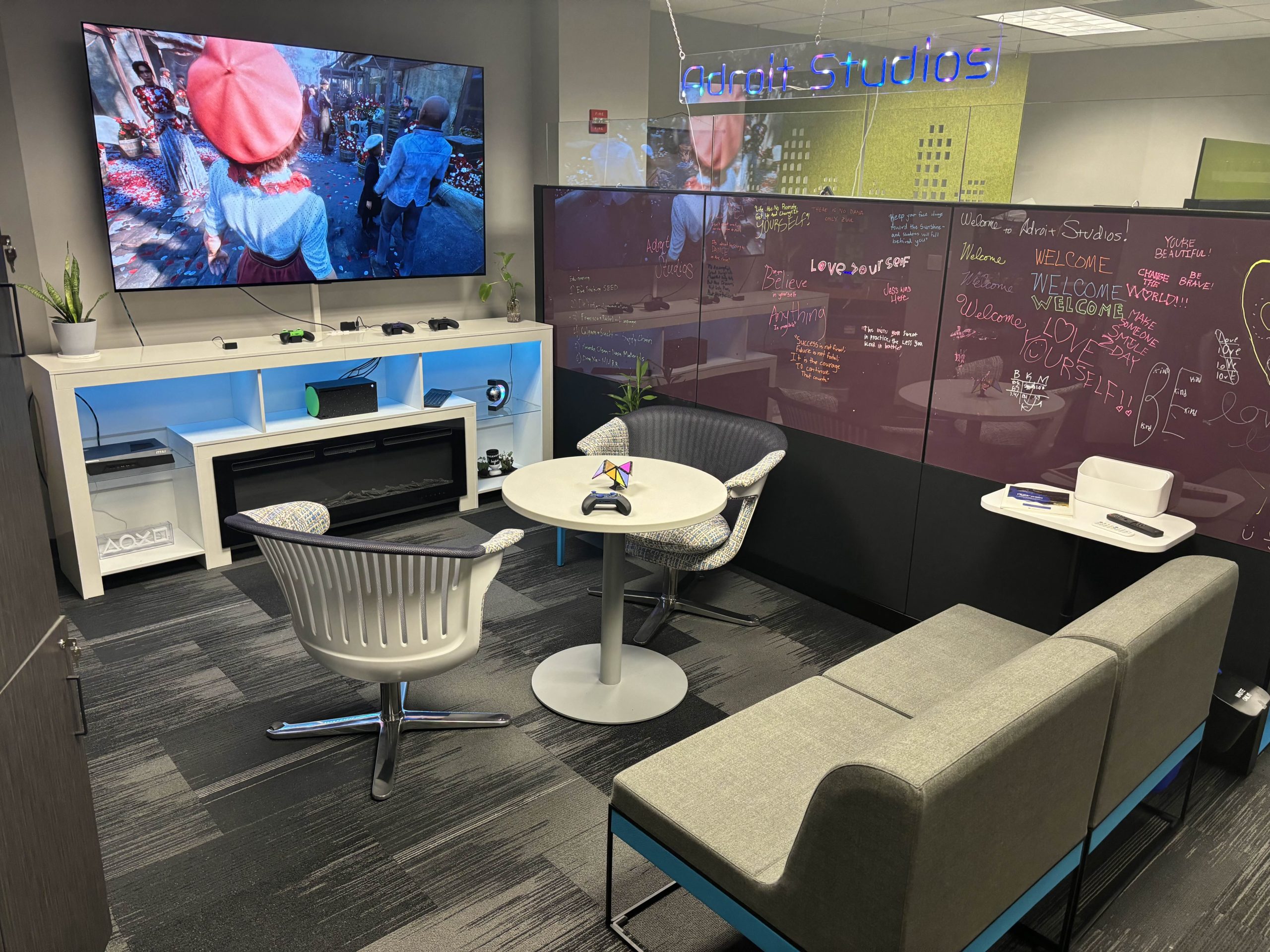 To encourage collaboration and creativity, the Adroit Studios area was reworked final summer season from a typical workplace area to 1 that comprises every little thing a budding online game designer may ask for. There are coding stations and sport improvement software program arrange, in addition to a sport testing station with a sofa, chairs, and a big TV. The heart of the room options maroon marker boards for brainstorming periods. In the nook, a sound sales space allows creators to conduct interviews or file sound results or music for video games. The newly revamped studio is any sport designer’s dream.