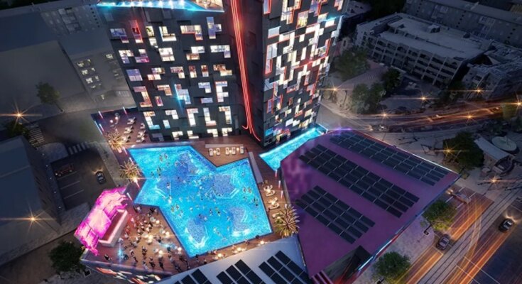 Photo renderings of the lodge present home windows formed like Tetris blocks and a purple three-pronged decoration alongside the primary tower designed to resemble the Atari emblem.