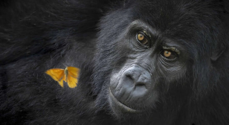 “It was a day defined by quiet connections. Beneath the lush canopy of Bwindi, I observed a young female gorilla gently nestled against the protective bulk of a silverback. The atmosphere was serene, filled with gentle sounds of the forest, until a sudden burst of delicate color broke through the calm. An unexpected visitor, a vibrant butterfly, appeared out of nowhere, fluttering gently through the air.”