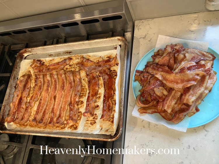Throughout the morning, I baked a number of pans of bacon so I might end off the field to filter out house in our fridge. The youngsters munched on bacon for his or her morning snack, and I obtained forward for upcoming bacon-based meals.