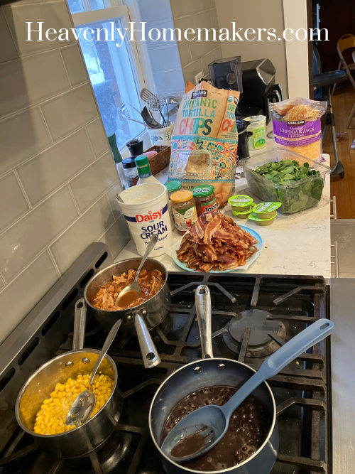 Dinner that evening was a FEAST. I’d taken all of the meat off the bones of our leftover BBQ Chicken Legs from Tuesday evening. There was Bacon. There was White Queso. We had BBQ Chicken Bacon Ranch Nachos for dinner and it was scrumptious. All of us had been house that evening as a result of snow had hit and was coming in quick, so we had been hunkering down for the evening.