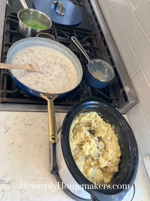 For dinner that evening, we had Sausage Gravy, Mashed Potatoes within the Crock Pot, and Peas.