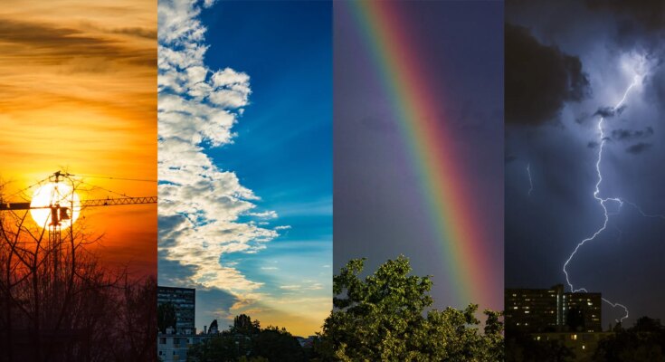 A split image shows four weather scenes: a sunset with an orange sky, blue sky with clouds, a rainbow over trees, and a nighttime thunderstorm with lightning above buildings.