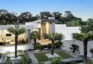 A double rainbow arcs across a partly cloudy sky above a large, rectangular apartment building surrounded by trees. Sunlight highlights the building, contrasting with the dark green foliage below.