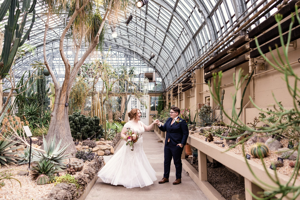 If you’re conversant in the Garfield Park Conservatory in Chicago, it ought to come as no shock that photographers completely LOVE this area. Mahala and Marla’s marriage ceremony was really the primary time I’d taken images there since January of 2020! We visited all of the rooms collectively (The Fern Room is my fave!) together with the in-bloom Monet Garden outdoors of Horticulture Hall. The area alone is a photographer’s dream, however… when newlyweds have a look at one another like this?? I may have taken images of them collectively all day!