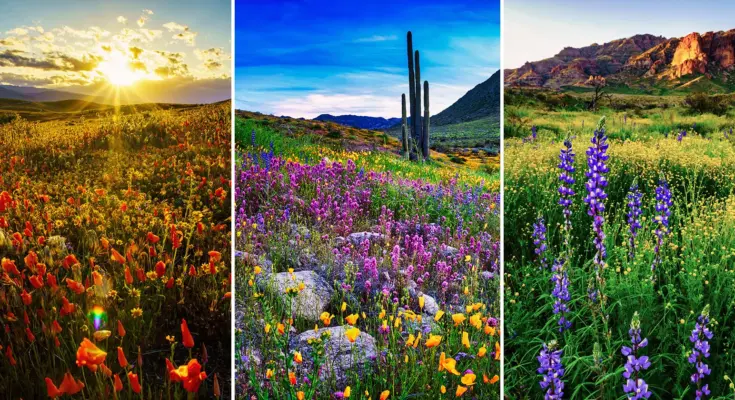 A collage of three vibrant desert wildflower scenes: a sunrise over poppies, cacti among multicolored blooms under a blue sky, and purple lupines with mountains in the background.