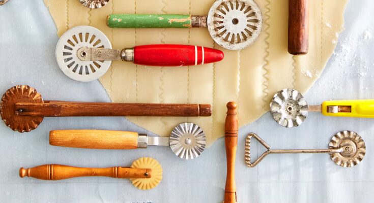 Pastry crimpers, or jaggers, have been popularized within the nineteenth century, as pies each savory and candy turned more and more widespread at mealtimes throughout Europe and past. Used to chop dough into shapes or lattice strips, these instruments have been first produced from whalebone and wooden and, later, steel and plastic. Older, hand-carved variations (backside left) in addition to midcentury Bakelite (inexperienced, far left) are typically pricier (round $75–$90), whereas plastic variations are barely extra reasonably priced (lower than $50).