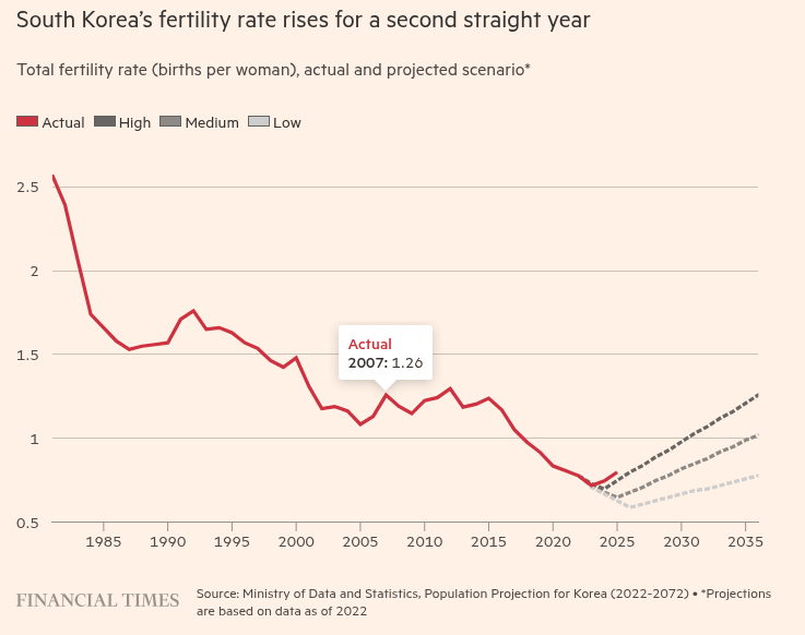 Korea’s whole fertility charge — the common variety of kids a lady is anticipated to have over her lifetime — climbed to 0.8 final yr, up from 0.75 in 2024 and an all-time low of 0.72 in 2023, official knowledge launched on Wednesday confirmed. The determine was higher than even the federal government’s most optimistic projections for 2025 however stays far beneath the two.1 threshold that demographers take into account obligatory to keep up a secure inhabitants, absent web immigration. Births climbed in 2025 to 254,500, up 6.8 per cent from the yr earlier than and the very best determine since 2021.