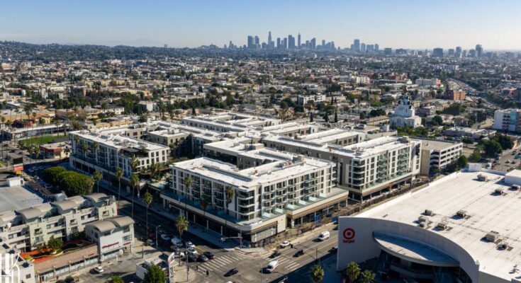 At the intersection of Sunset Boulevard and Western Avenue in Hollywood, the outside of a brand new mixed-use condominium complicated American Commercial Equities is nearing completion.