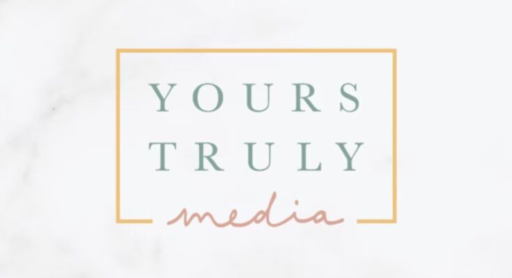 A logo with the text "YOURS TRULY" in green uppercase letters above the word "media" in pink script, all inside a yellow rectangular border on a light background.