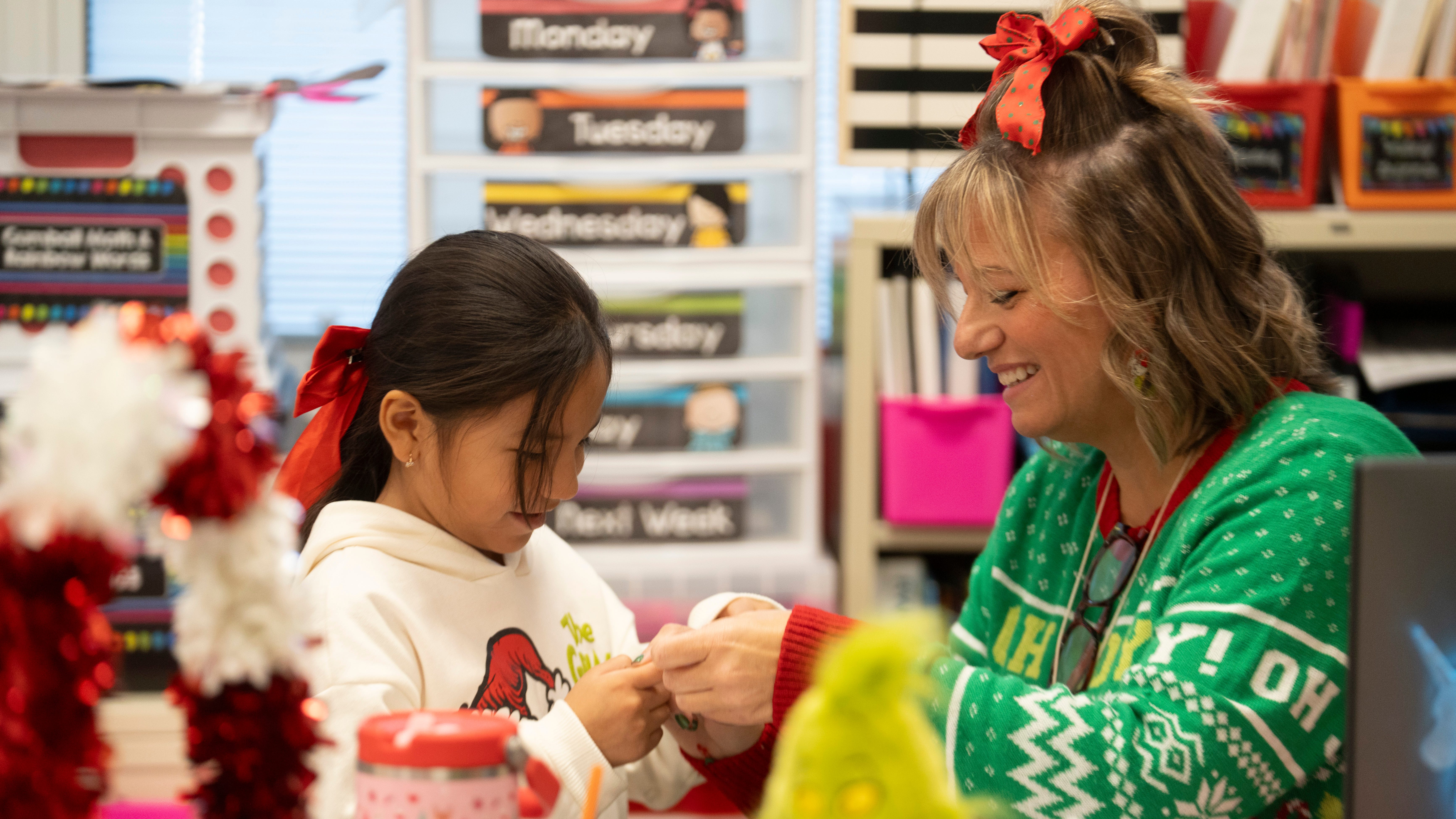 Carly Saal, first grade instructor, shares laughs with college students throughout their annual Grinch Day at Haledon Public School on Friday, Dec. 5, 2025.