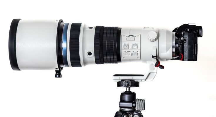 A white OM System telephoto camera lens attached to a black OM-1 Mark II camera is mounted on a tripod with a white background.
