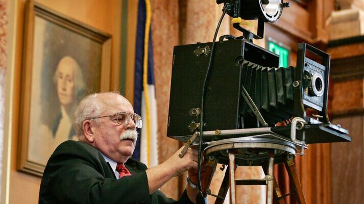 Photographer Charlie Stover, of Norwalk, Iowa, makes use of his Cirkut digital camera to shoot a panoramic picture within the Iowa House, Tuesday, Jan. 25, 2005, on the Statehouse in Des Moines, Iowa. (AP Photo/Charlie Neibergall)