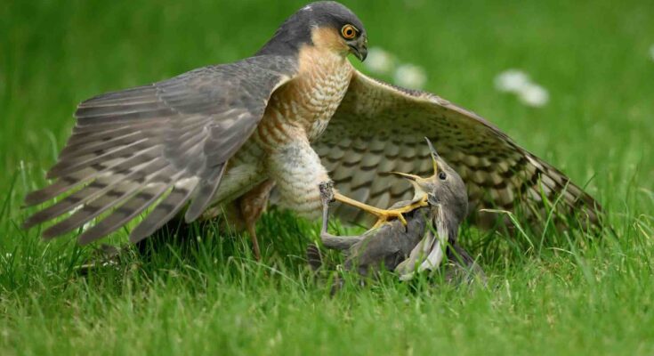 Mark Parker’s dramatic picture captures the second a sparrowhawk pounces on a starling. “Because the sparrowhawk had never gone to ground before on previous visits to the garden and not knowing how long it would stay, I just wanted to get an image to record the event before then concentrating on my settings,” he says. – Mark Parker/British Wildlife Photography Awards