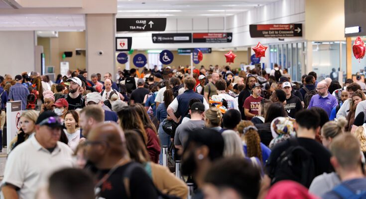 Travelers wait in line at a Transportation Security Administration checkpoint at William P. Hobby Airport in Houston, Texas, on March 9, 2026. (Mark Felix/Bloomberg through Getty Images / Getty Images)