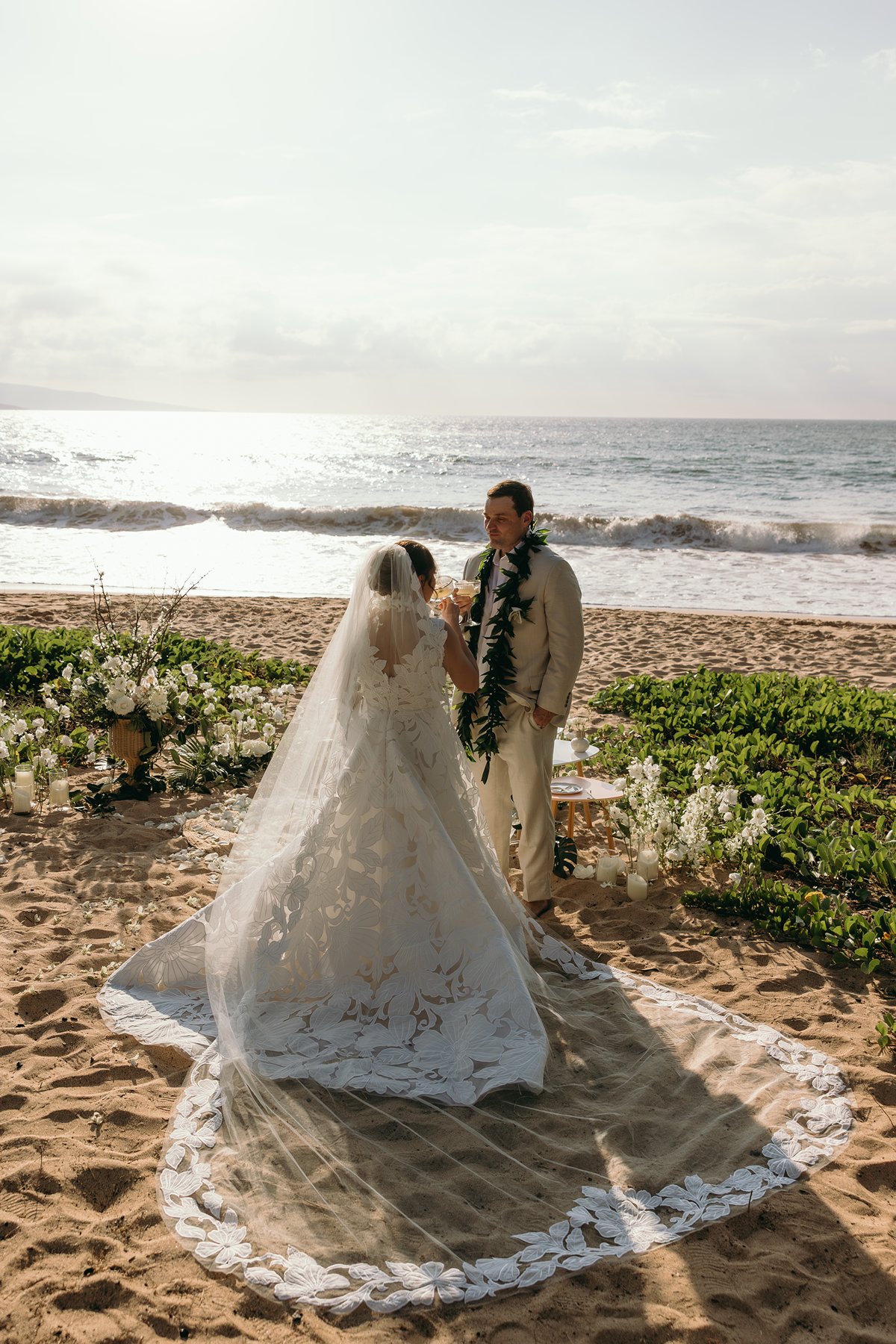 We began their Maui elopement at a quiet seashore in Wailea. One of these spots that seems like your personal little secret, the place you largely hear waves and wind as a substitute of crowds.  They did their first look proper there within the sand earlier than the ceremony. First seems to be throughout a Maui elopement all the time have this quiet sort of pleasure to them. The nerves settle, the grins get larger, and all of a sudden the entire day feels actual. Just the 2 of them seeing one another for the primary time that day, taking a second to breathe, snort a bit of, and settle in at first formally begins.