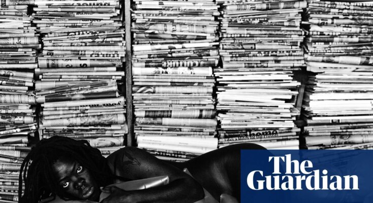 In “Julile”, which interprets as “the one who thinks deeply”, the artist lies bare on a rug clasping to their physique plastic baggage blown up like silken balloons. The pose attracts the traditional curves of a wonderful nude in opposition to a backdrop of piled-up newspapers. “This was in my lounge, a few days before I had an operation to remove fibroids. I was in a state, counting down the days before that big operation, thinking deeply of what was about to come and how my body was to change for worse or the better. It made me think about sexuality and illnesses and the sicknesses that consume us. When you have fibroids, it’s like something in your blood is consumed by these forces that live within your body, caused by trauma or stress. So I was thinking deeply about the sense of self and belonging and about existence, you know – my experience, my pain, my survival.”