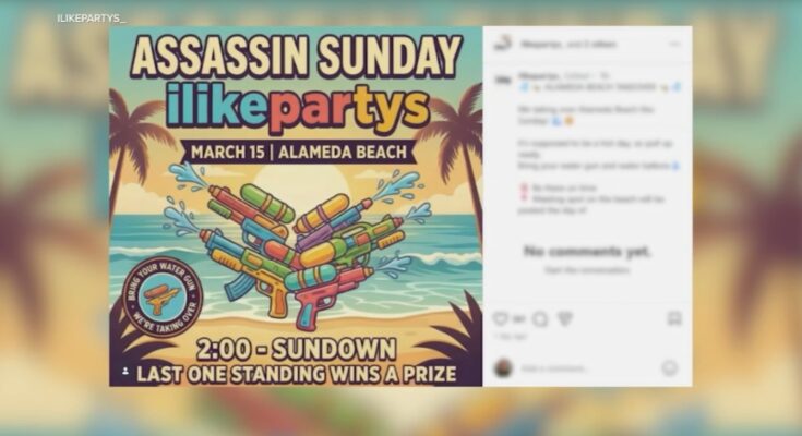 ALAMEDA, Calif. (KGO) — A flyer circulating on social media is drawing some concern. It promotes a celebration known as “Assassin Sunday” for this weekend at Alameda Beach. It says final “one standing wins a prize.”