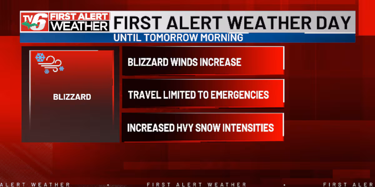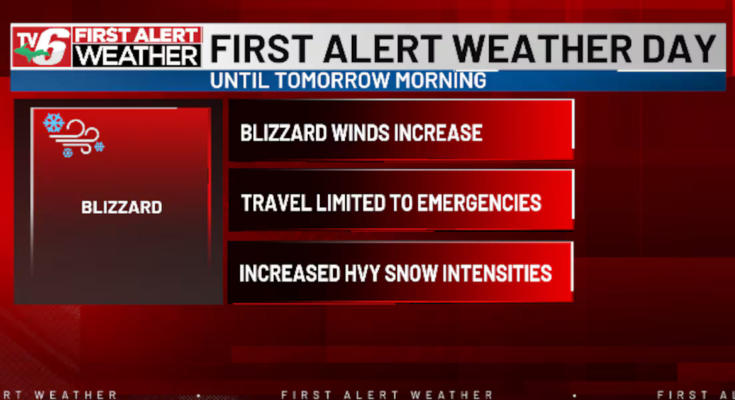 MARQUETTE, Mich. (WLUC) -We’re persevering with a First Alert Weather Day on this second day of a historic winter storm and blizzard! After an in a single day lull, winds and snow are growing. Gusts will proceed to vary 45-55mph with round 60mph gusts alongside Lake Superior. This is inflicting whiteouts for many of the Central and Eastern U.P. Travel is proscribed to emergency and important employees. Power outages will possible proceed to develop because the winds enhance. Wind will start to weaken this night and extra so tonight.