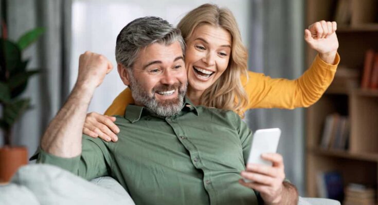 Excited couple celebrating success while looking at smartphone.