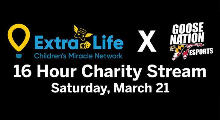 black background with logos and text reading "Extra Life Children's Miracle Network times Goose Nation Esports 16-hour Charity Stream Saturday, March 21"