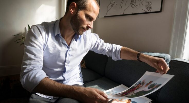 man looking at photographs