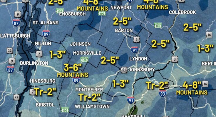 Northern Green Mountains and Northeast Kingdom: Snow develops Friday afternoon, with larger totals and impacts to journey in larger elevations. The northernmost mountain summits might see upwards of 6″ of snow, with a widespread 2″ to five″ anticipated. The decrease elevations of Caledonia, Lamoille and Washington County will seemingly see decrease quantities within the dusting to three″ vary, with decrease totals the farther south and decrease in elevation you’re. Snow wraps up earlier than midnight for many.