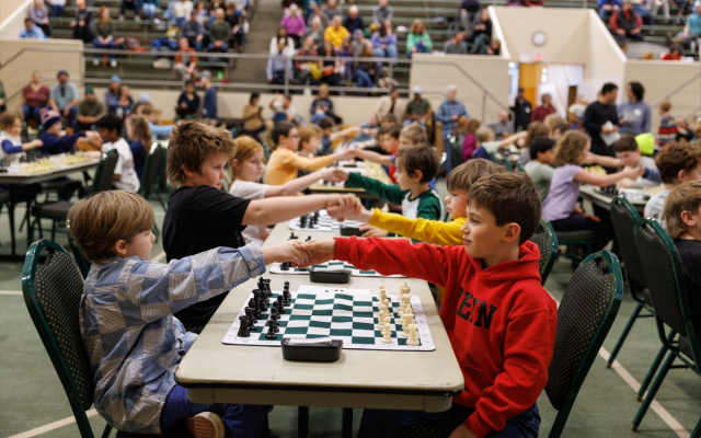 After lunch, youngsters of all ages sat behind chess units all through the fitness center, shook palms and started enjoying. Quite a sight.