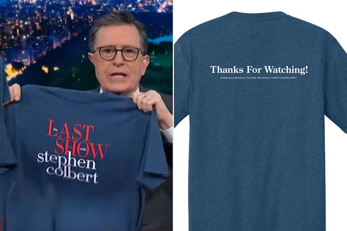 “On the front, they read: ‘The Last Show with Stephen Colbert,'” Colbert, 61, introduced as he confirmed off the merchandise on air. “And on the back, it reads: ‘Thanks for watching! (Unless you watched on YouTube, the network couldn’t monetize that).'”