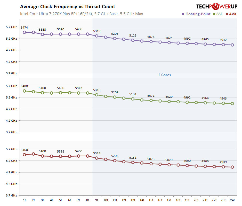 Note that the P-Cores are all the time clocked near their most, even when a number of P-Cores are lively. The gradual drop towards the fitting facet is somewhat bit deceptive, as a result of we maintain including extra E-Cores to the combo, which run at a decrease frequency, dragging down the typical.
