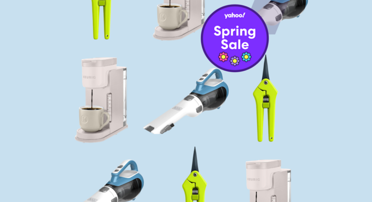 A Keurig, hand vacuum and gardening shears in a repeating pattern against a blue background, with a badge that says: Yahoo! Spring Sale