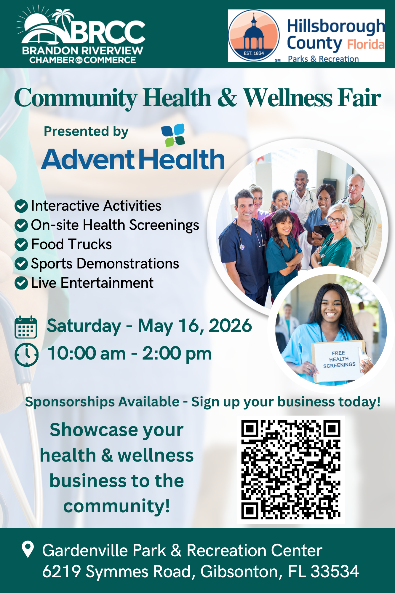 The Brandon Riverview Chamber of Commerce is proud to announce its Community Health & Wellness Fair, going down Saturday, May 16, from 10 a.m.-2 p.m. on the Gardenville Park & Recreation Center, situated at 6219 Symmes Rd. in Gibsonton.