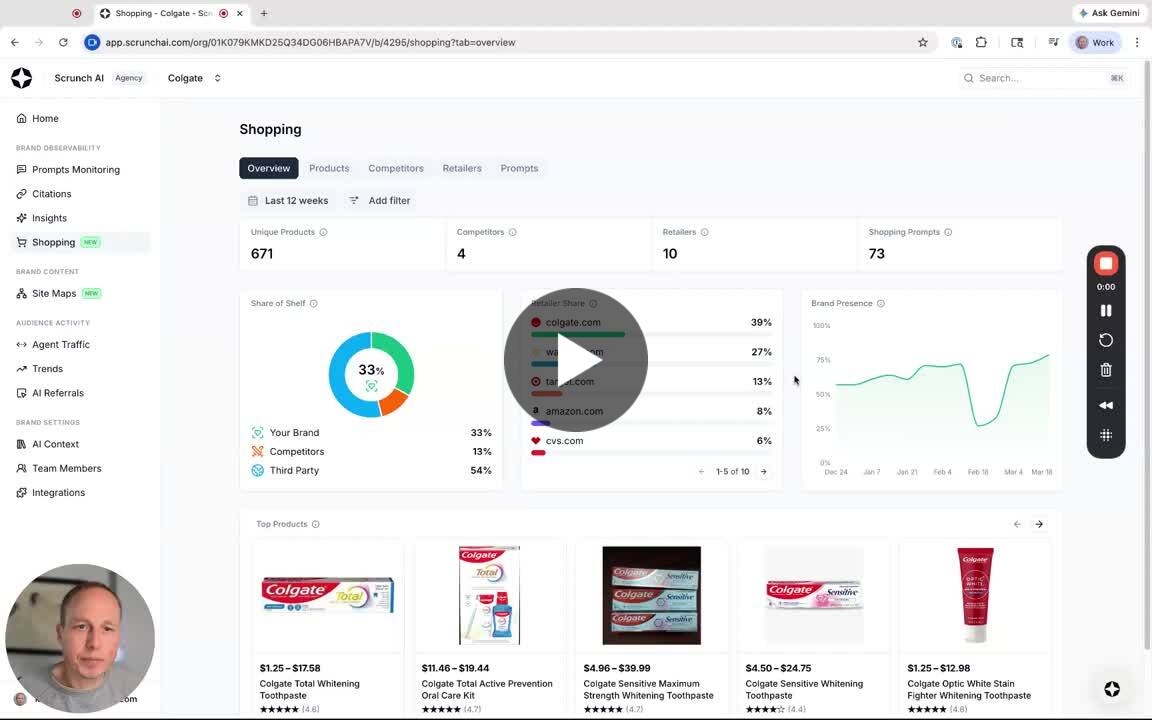 Hey, Kevin, from scratch right here and say I’m strolling by our procuring function inside Scrunch, which tells you not solely how your retail ecommerce model is performing an AI search, but in addition how particular merchandise and SKUs are performing. So that is the dashboard view we’re taking a look at right here. I’ve Colgate for example and there is just a few excessive stage issues we’re exhibiting on this overview dashboard like Sheriff Shelf, the way you’re evaluating versus your opponents. We have a retailer share which is slightly bit totally different, like what retailers are promoting your product. And who’s profitable the share there after which your model presence time beyond regulation together with some prime merchandise. Fun reality right here is that Colgate Optic White is definitely the toothpaste that I take advantage of at house. So I can drill into any of those particular merchandise right here. I can see worth comparisons by retailers. I may also see how what place this product is has over time throughout AI search outcomes. And I may also see the prompts that it is exhibiting up for within the place inside these prompts. So I’m going to hop again over to. Are procuring tab right here after which we are able to drill into every of the sections right here 1 by 1. All proper, so hopping over to our merchandise tab right here. This provides us an summary of how our personal branded merchandise are performing throughout totally different AI platforms. We can see the variety of merchandise which are being picked up. We can see our common shelf place. The decrease finish of the quantity right here, the higher. It’s form of shares the place your product is exhibiting up inside the LLM outcomes themselves and we are able to get a score of what these merchandise are. If we go a stage deeper right here, we are able to see the merchandise which are being dropped, which are falling off the AI solutions or that. Newly trending on, newly being added. We may also get a way of product motion by change in place right here. So you’ll be able to see form of merchandise which are trending up in consciousness on totally different platforms. Alright, so let’s jump over to this opponents tab and we’ll cowl this subsequent. Alright, so this opponents tab reveals an summary of the highest opponents in your house. We can see what our Sheriff shelf is in comparison with the opposite aggressive merchandise. We can see how usually our manufacturers merchandise are profitable the highest outcomes versus our opponents and we are able to additionally have a look at the competitor Co prevalence. This is the instances that aggressive merchandise are proven within the LLM reply concurrently our product. One factor I actually like about this view is you’ll be able to have a look at. Scatterplot charts of the place all of the merchandise are exhibiting up. I can filter down my model to see how usually I’m exhibiting up on this prime proper chief quadrant. I can have a look at opponents and I can have a look at different third occasion manufacturers which are exhibiting up and any considered one of these that I’ve over, I can see the precise product that’s exhibiting up on this place. All proper, so let’s jump over to this retail retailers tab and we are able to shut it out. Or is it over on our retailers tab? This takes slightly little bit of nuance to clarify. So along with the aggressive and aggressive merchandise that we’re monitoring which are exhibiting up in AI search outcomes, we’re additionally wanting right here on the retailers, the web sites that the AI platforms are directing customers to take a look at and buy our merchandise. So on this view, we are able to see our direct to client share. This can be the share of citations the place the alms are directing to Colgate. Come versus the opposite third occasion websites, the opposite third occasion retailers, we are able to see you already know what retailers have essentially the most share of citations and directed site visitors. We can see additionally the place there are Co retailers which are being prompt inside the AI search outcomes. Again, we’ve got a pleasant little scatter plot chart right here that reveals you the highest retailers which are exhibiting up. So you’ll be able to form of get a way of the place customers are going to and the place AI is directing these customers to go to to take a look at and buy the product. And then final thing you need to present is only a deep dive into the prompts which are powering all the information behind this. Alright, so to shut issues out, we’ve got our immediate tab right here, which goes to provide us an in depth view of all of the prompts that we’re utilizing to energy the procuring expertise. One good factor that we do for you right here is present you the prompts which are lacking your model. We are opponents are exhibiting up, so you need to use this to tell your AI search or quotation technique. We’ll additionally present you this detailed stage view of the prompts the place your model could or is probably not exhibiting up. I can click on into this and get it extra granular element view of. You know the way my mind is exhibiting up throughout a number of totally different fashions after which once more, I can click on into every mannequin and see each day snapshots of the place my model presence is that if I’m being cited or not. So that is all the identical form of stage of immediate element that we present you inside Scrunch by default, however it’s now utilized on the product stage. So that is it. I do know it is form of an extended 1, so thanks for watching and have a great one.