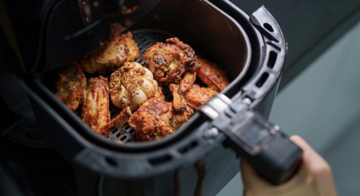 A girl is utilizing an air fryer to arrange grilled hen in her kitchen, specializing in a more healthy cooking technique with minimal oil.