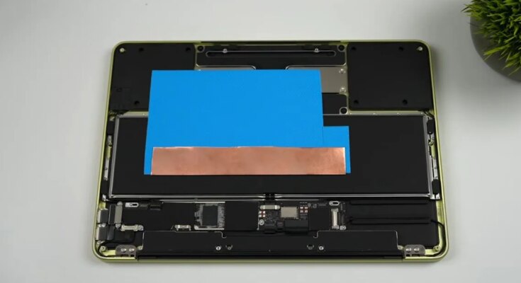Technically the ‘heatsink’ for this laptop computer is the aluminium case, because the SoC is coupled through a thermal pad to the case. This doesn’t depart loads of house and the case will warmth soak fairly quick, whereas additionally making retrofitting a cooling answer a problem.