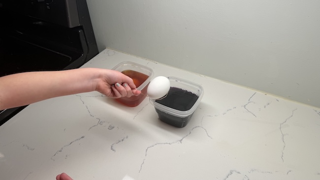 - Place cool hard-boiled eggs into the dye bathtub.