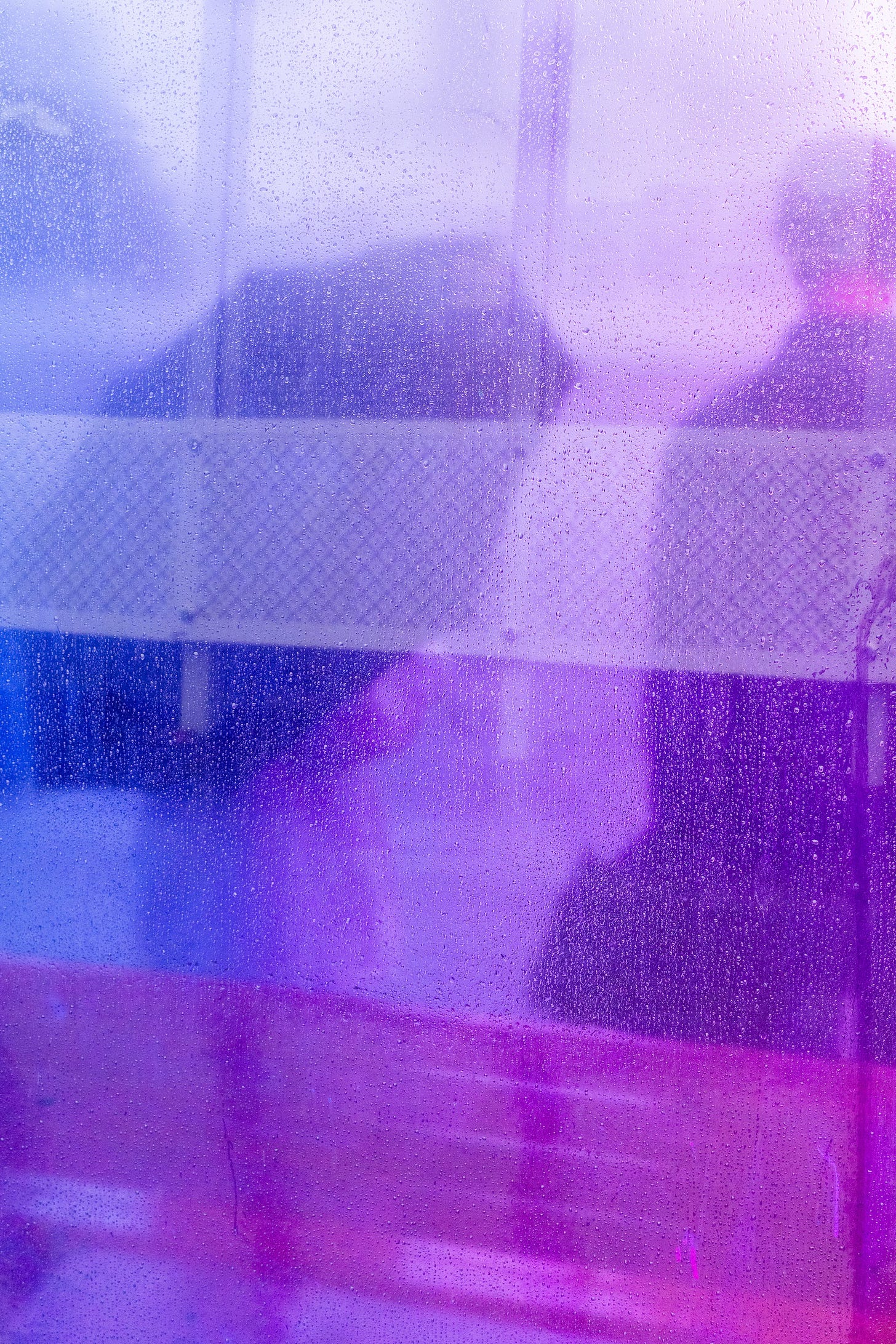 I grew to become conscious of delicate adjustments within the colors, mild ranges, and visible depth because the clouds shifted between mild and darkish tones of bluish gray, the wind pushed arduous after which died down, and the rain alternated between giant, pelting drops and sharp horizontal sheets. Moving figures, the form and lights of passing automobiles, and illuminated indicators within the distance — all had been blurred, distorted, and tinted by the rain-textured glass. Rivulets ran down and throughout the floor, directed by the competing forces of gravity and wind.