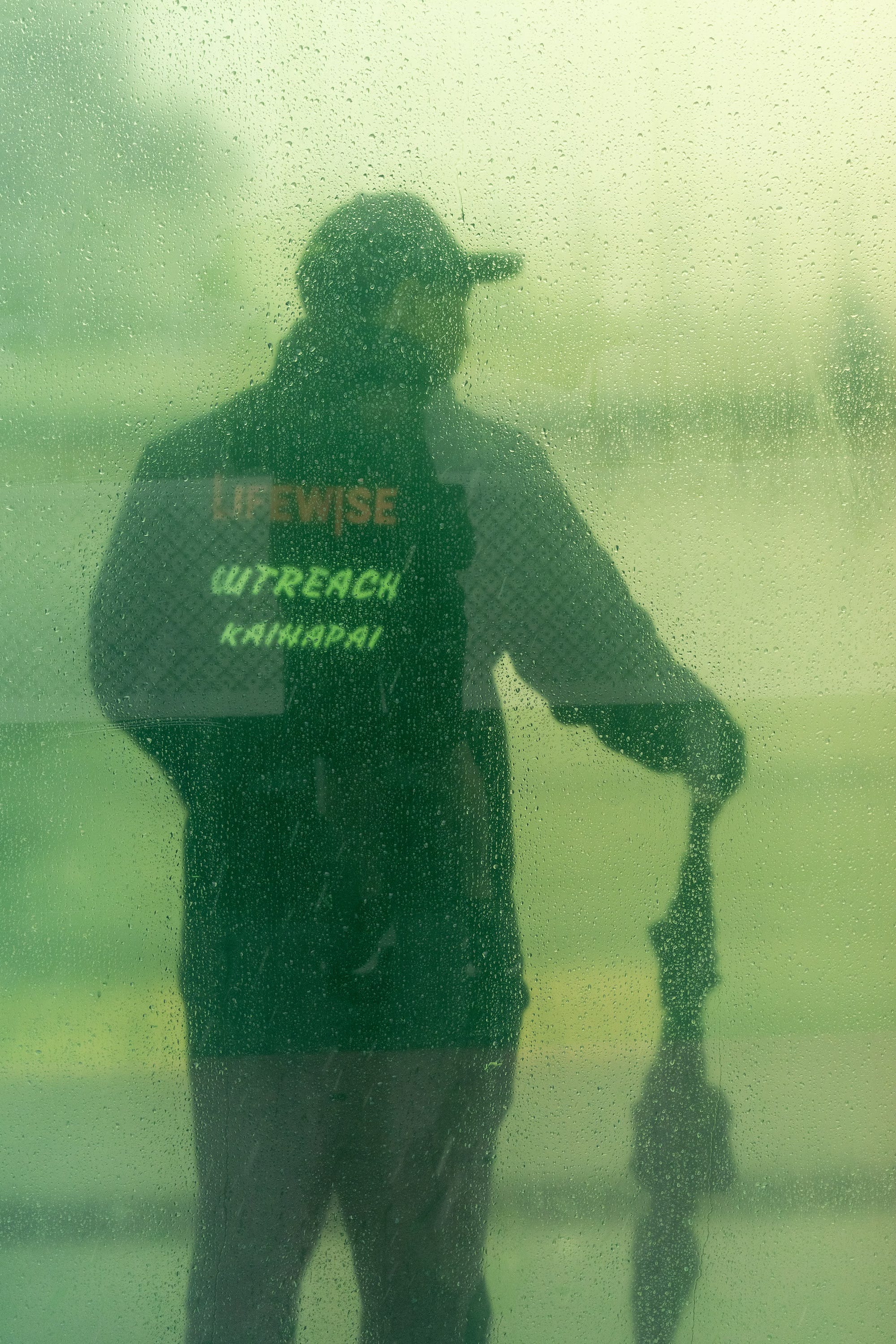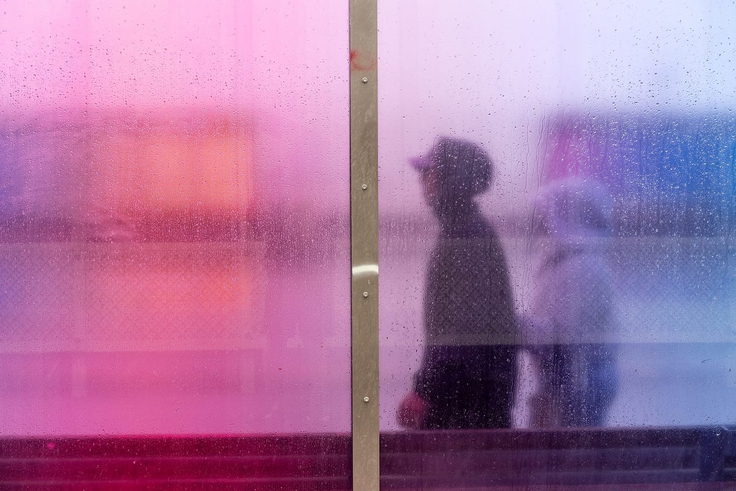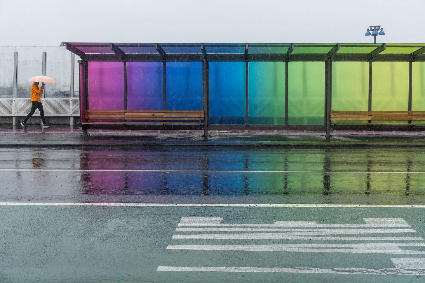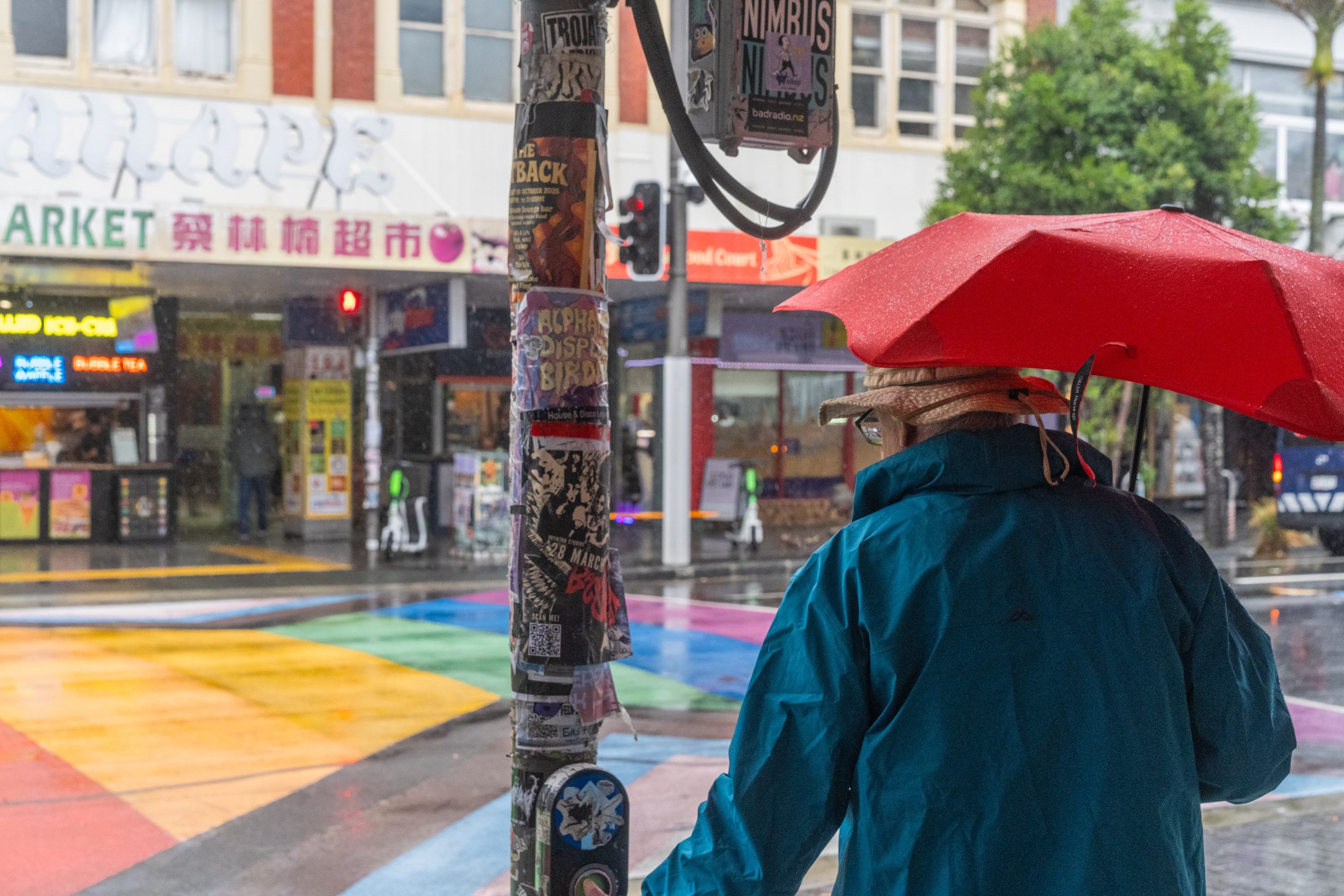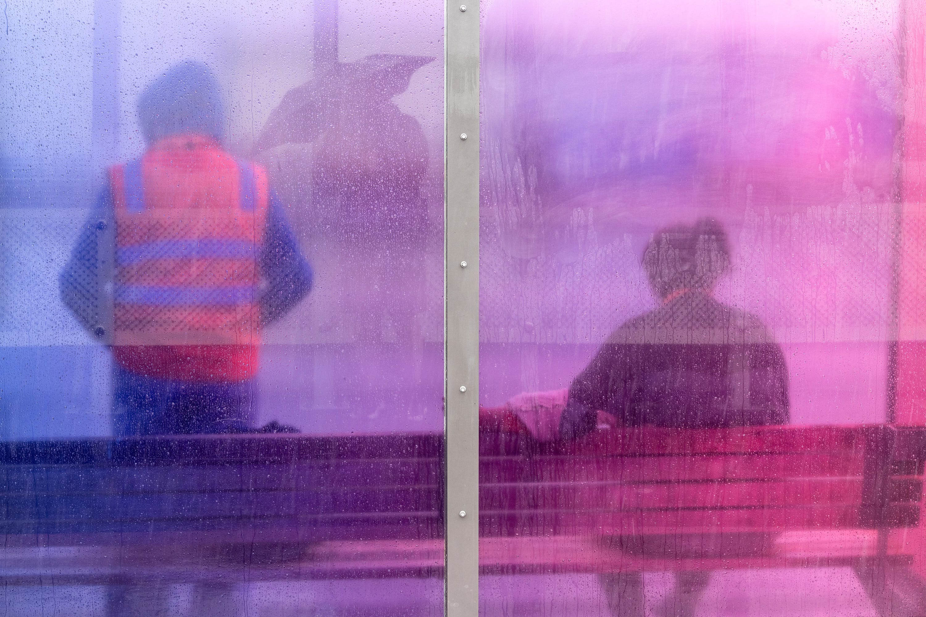 I lastly reached the Rainbow Bridge which, sadly, was utterly uncovered to the howling winds. The lengthy, vibrant bus stops — two on either side of Karangahape Road — supplied some safety for the few folks courageous sufficient to be exterior in such depressing climate and unfortunate sufficient to be ready for a bus. I needed to take photographs of individuals by way of the moist colored glass, so a small umbrella was my solely safety. Checking to both facet often for passing scooters and bicycles, I walked forwards and backwards behind the colored panes observing as folks waited and watched for his or her bus.